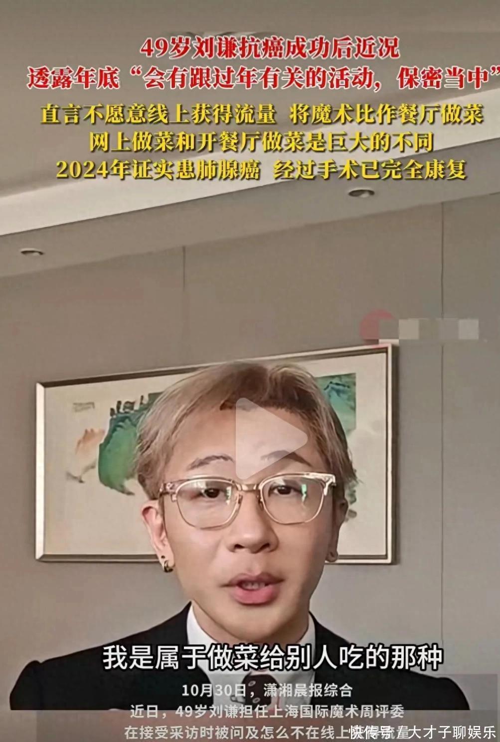 本届魔术周以“从魔术到戏剧”为主题,策划两大核心演出板块,上演两台八场演出。魔术周新人赛今年创下历史之最,成为上海国际魔术周规模最大、报名人数最多的一届赛事。来自中国、日本、韩国位魔术师入围,境外选手比例显著增加。刘谦在采访中表示,“好品位是新人魔术师最需要的素质。”关于未来计划,刘谦透露年底行程“会有跟过年有关的活动,保密当中”,引发外界对他可能重返春晚的猜测。04 生命感悟:肺腺癌带来的改变刘谦的肺腺癌发现得非常及时,属于零期,医生表示治愈率超%。